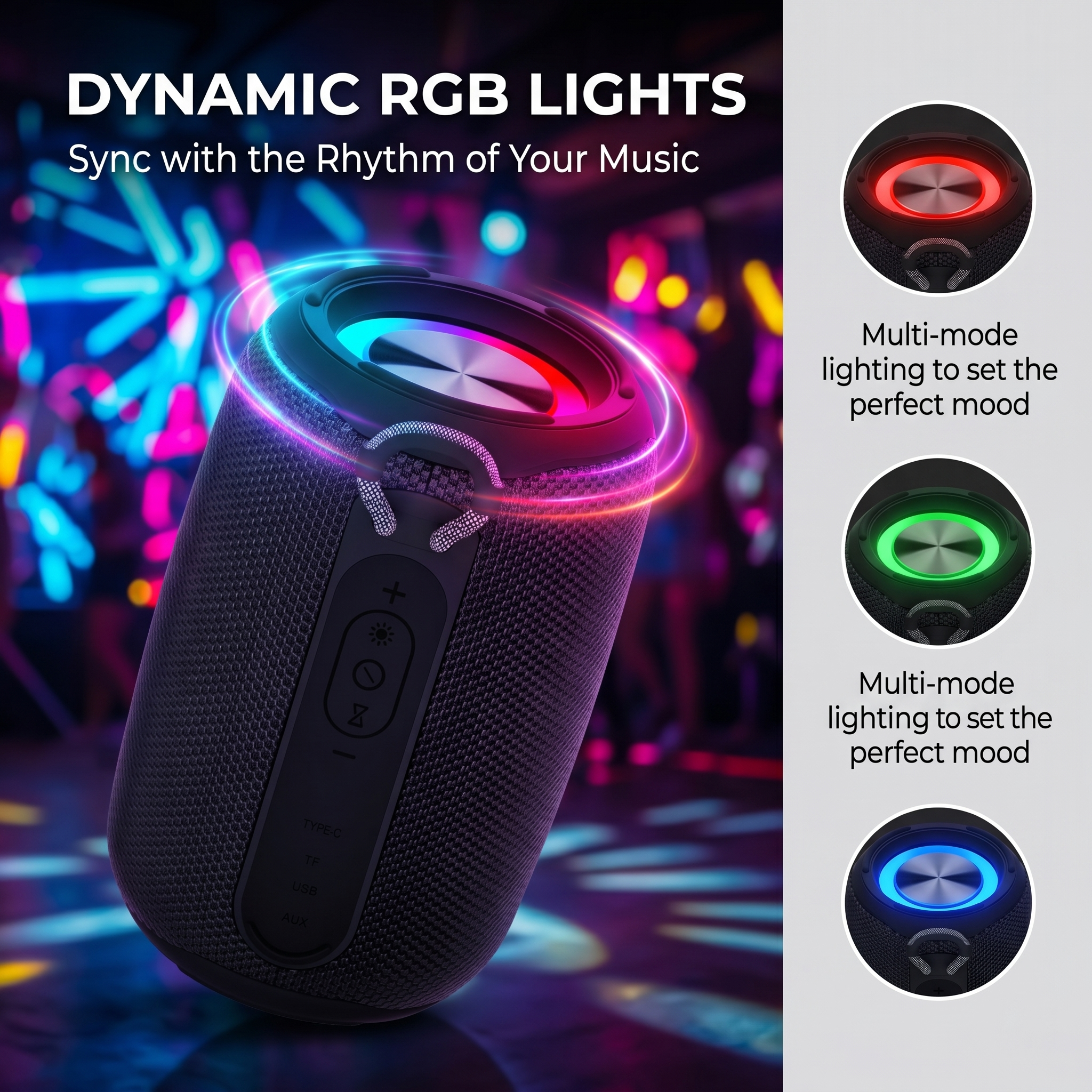 Multi-mode RGB lights that flash with music rhythm, turn parties & home into vibe zones instantly