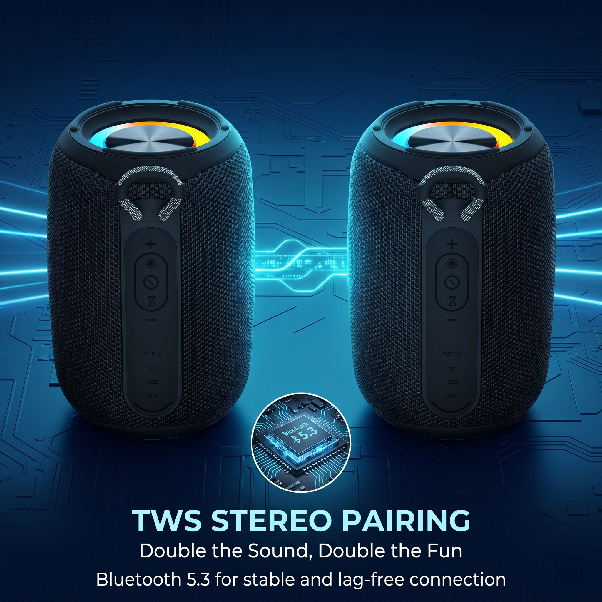 Supports TWS dual-speaker pairing, independent L/R channel output, cinema-grade stereo sound