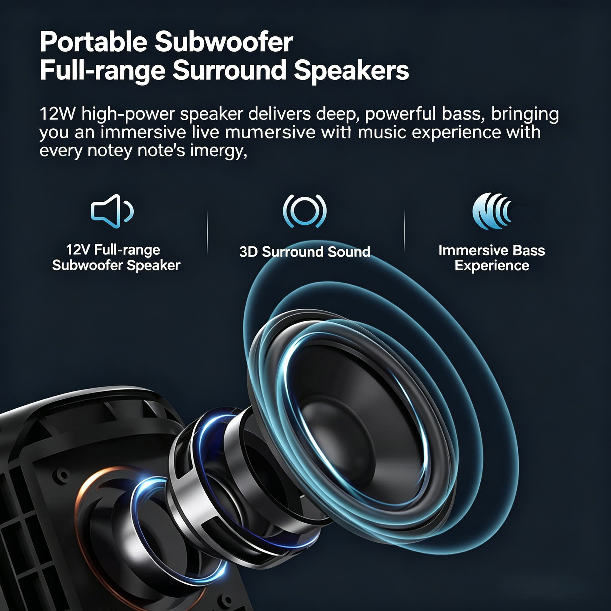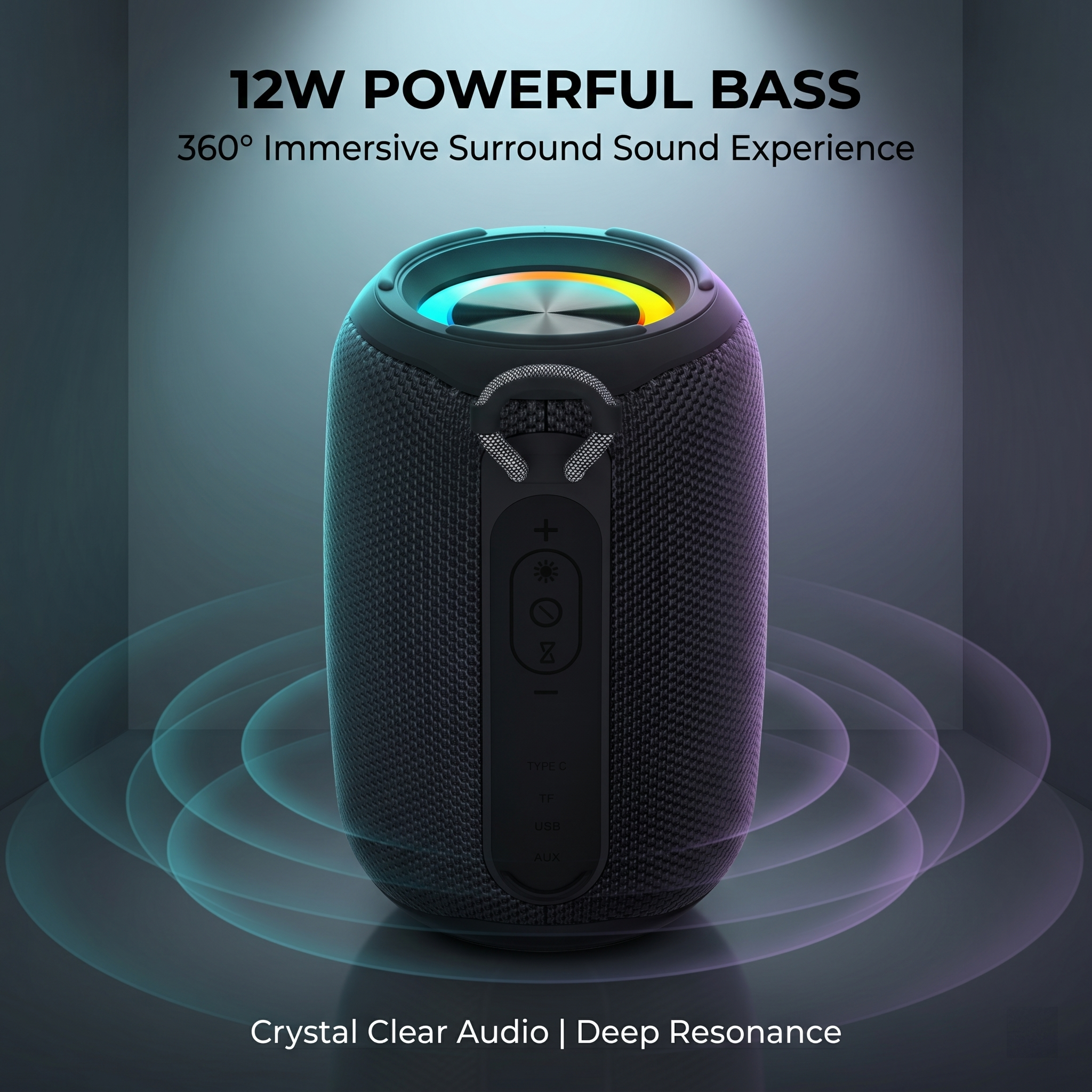 12W high-power output, 360° immersive surround sound, no distortion at high volume, full party atmosphere