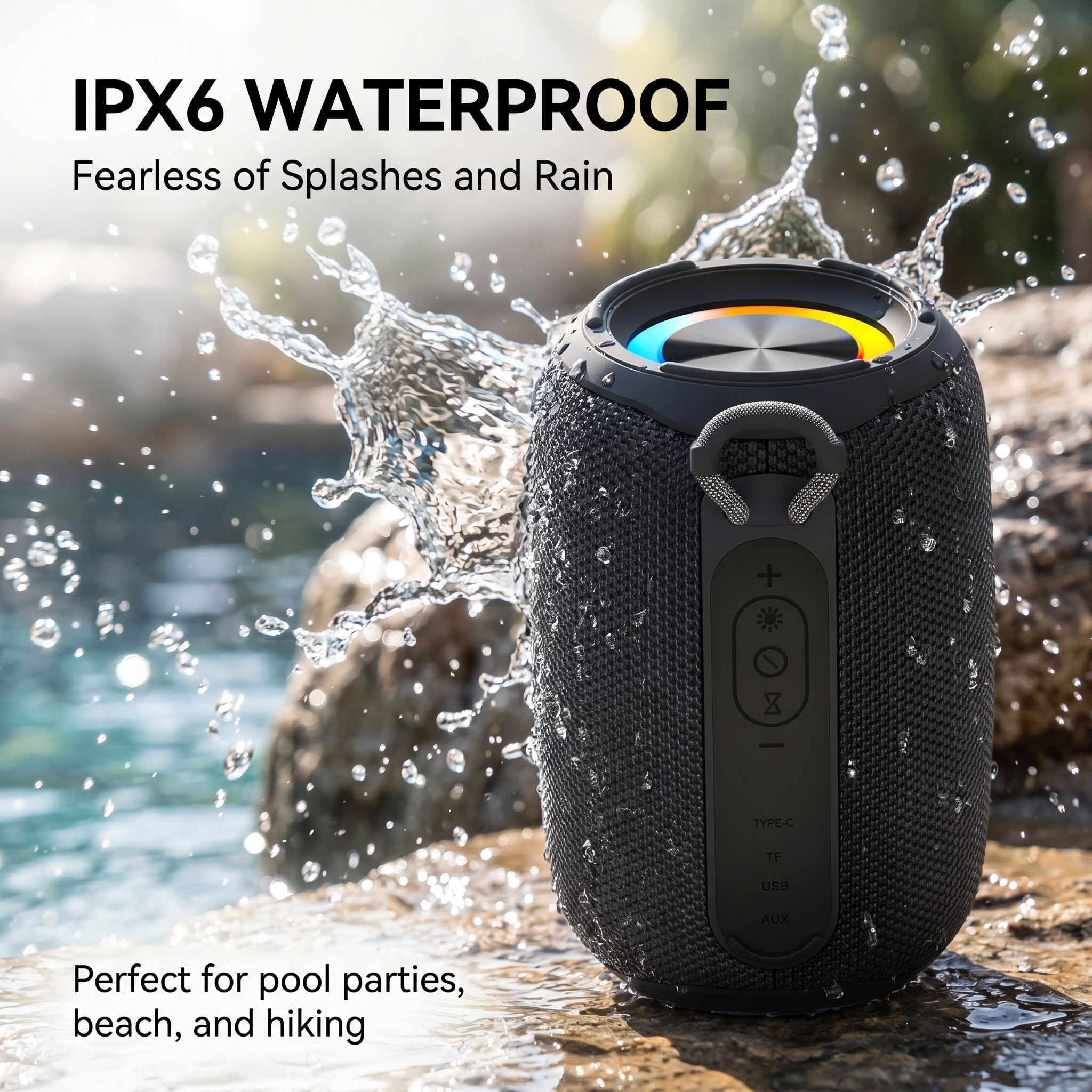 IPX6 waterproof, fearless of splashes & rain, ideal for pool parties, beach trips & hiking