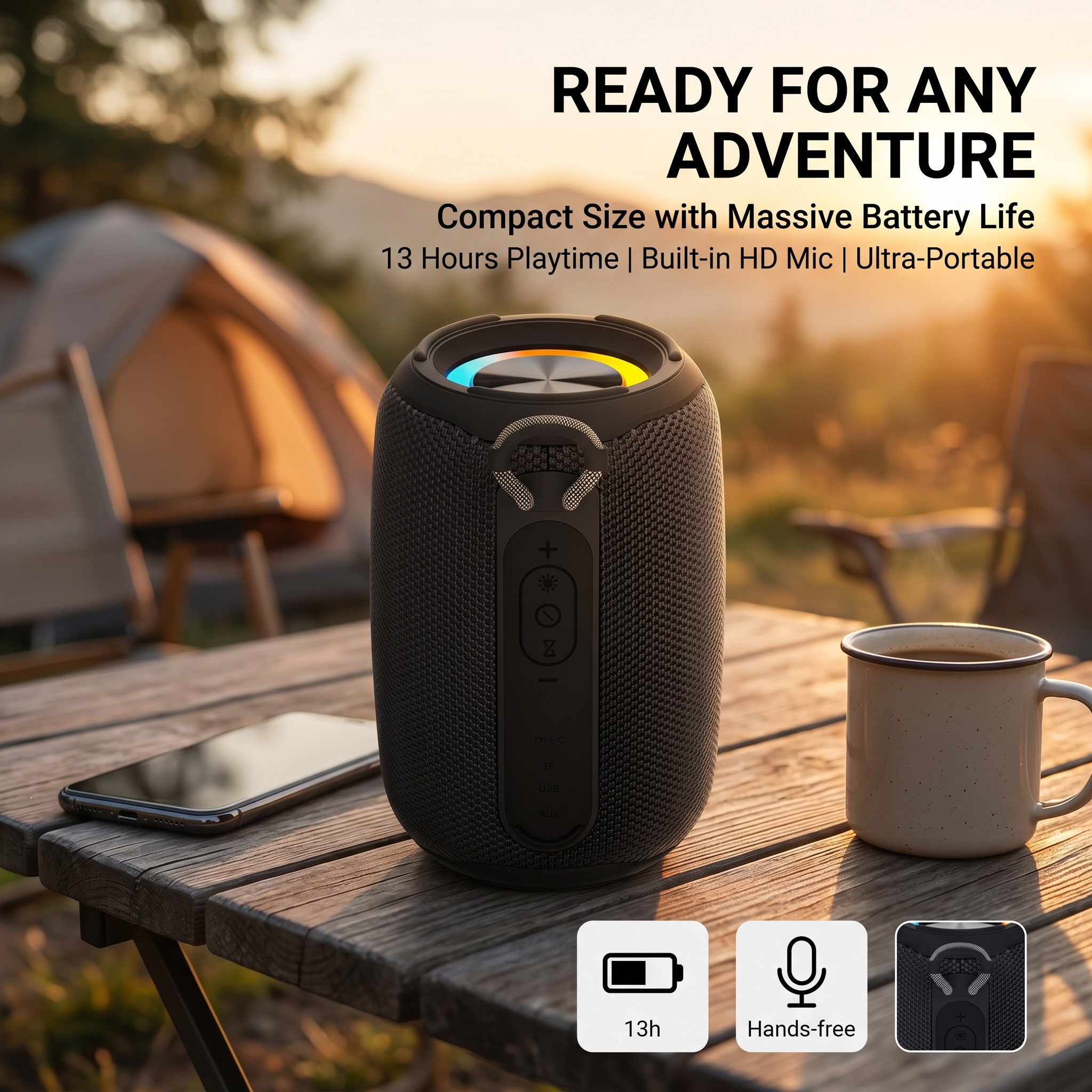 13-hour playtime, ultra-portable design with built-in mic, perfect for camping, picnics & cycling