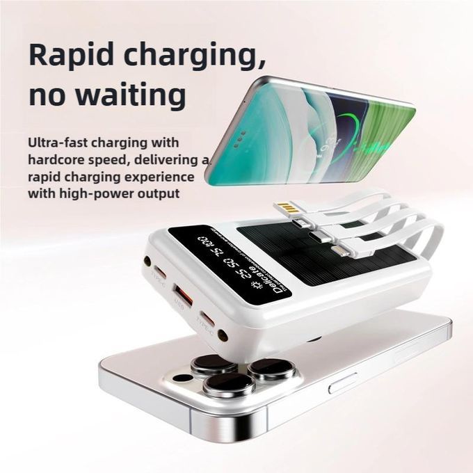 With high-power fast charging output, it delivers ultra-fast charging speed for your devices. The built-in 4 universal cables (Lightning, Type-C, Micro USB, USB) mean you don't need to carry extra cables — charge directly, anytime, anywhere.No more long waits for charging, get your phone back to full power in a flash.