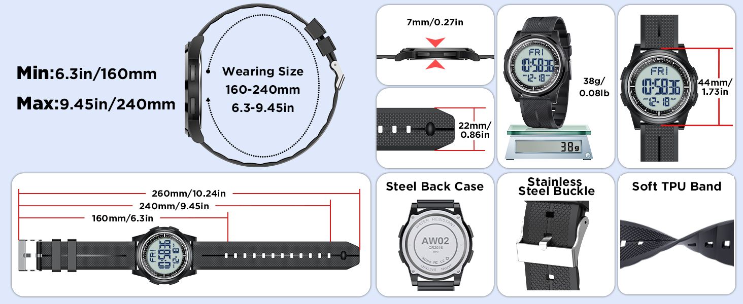 - One-stop full function coverage: stopwatch timing, countdown, dual time zone, alarm, hourly chime, 5-minute snooze, calendar week display, 12/24 hour format switching, meeting all your daily needs