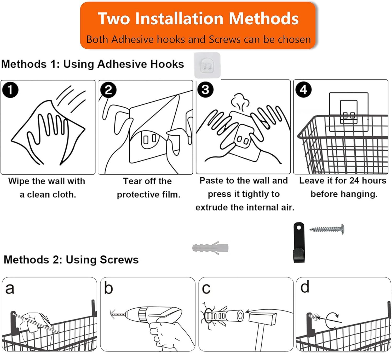 Q: Do I need to drill holes in my wall to install these?A: No. We include heavy-duty, damage-free adhesive hooks with every set. You can install the baskets in minutes on any smooth wall, door, or cabinet surface, with no drilling, no tools, and no damage to your walls — perfect for renters and tenants.