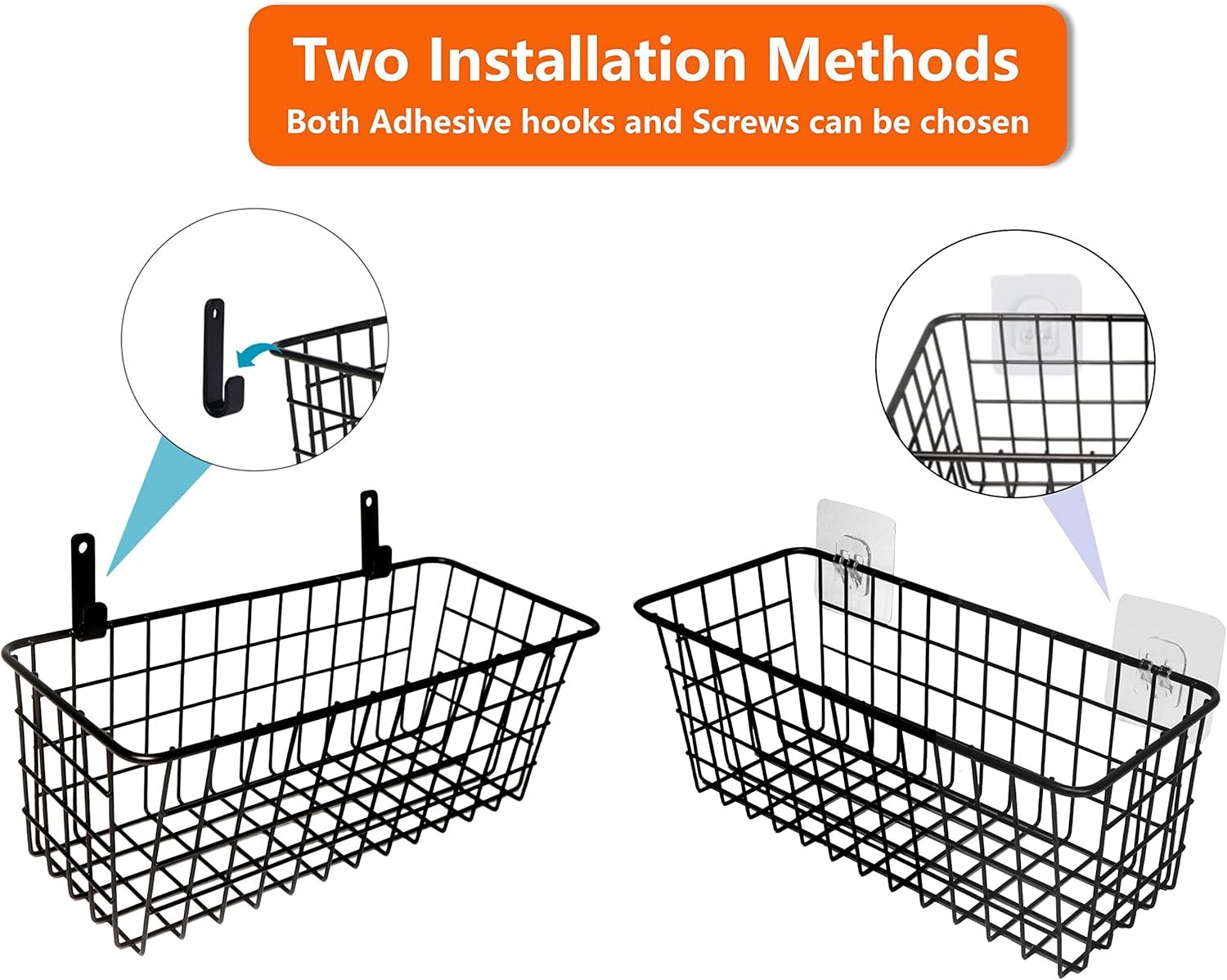 No need for complex tools, drilling, or damage to your walls! Our baskets install in minutes with the included heavy-duty adhesive hooks, perfect for renters, tenants, and anyone who doesn't want to damage their walls. You can mount them on any smooth wall, door, cabinet, or even vehicle interior, with zero permanent damage.