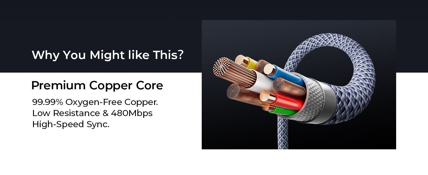 - 99.99% Oxygen-Free Copper Core, low resistance and high conductivity, no overheating during charging, fast charging without harming devices, extends battery life