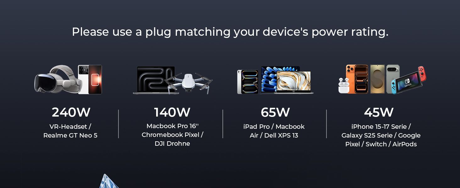 - Backward compatible with 140W/65W/45W/20W full power, universal for phones, tablets, laptops, Switch, VR devices, one cable for all charging needs