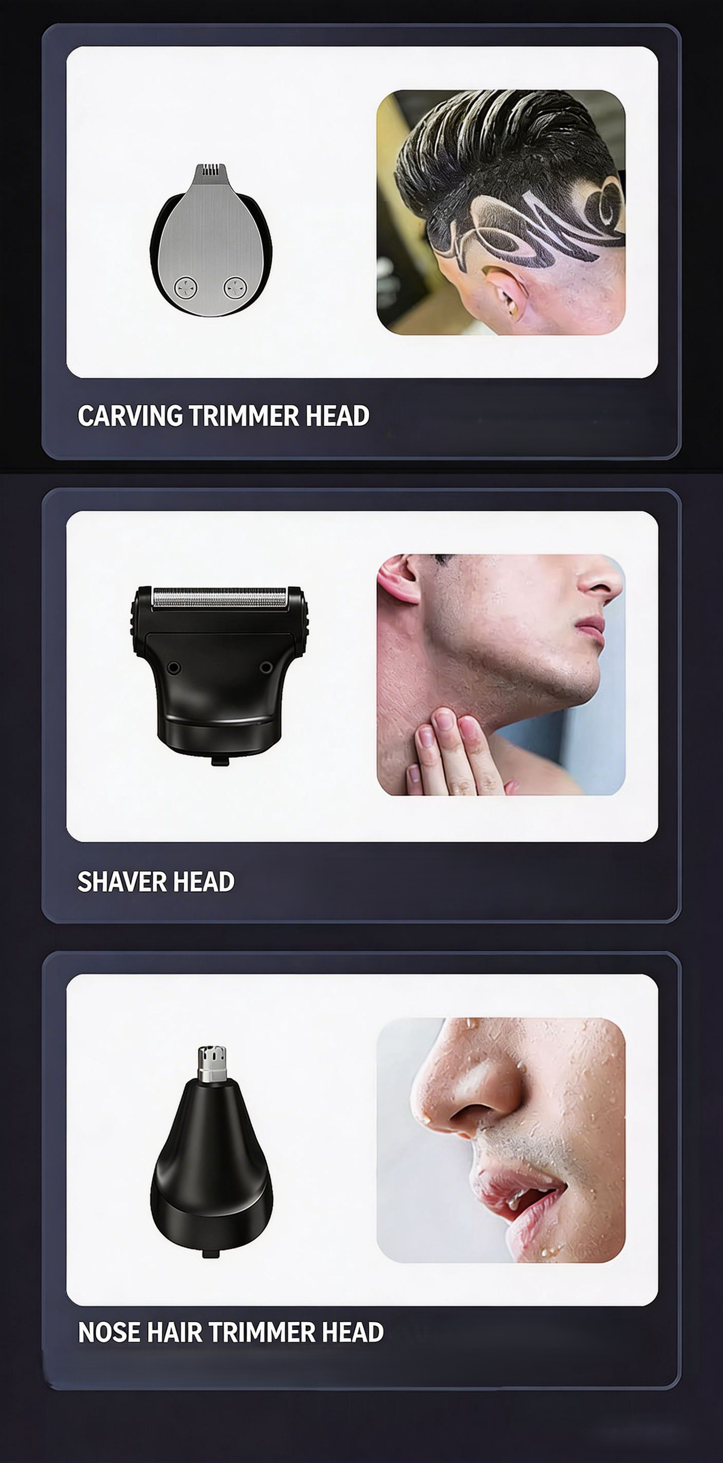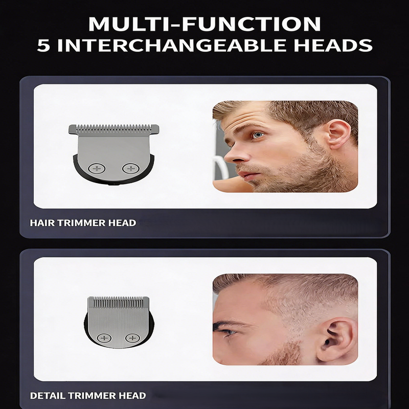 5 interchangeable heads for different looks, from daily trims to personalized carving