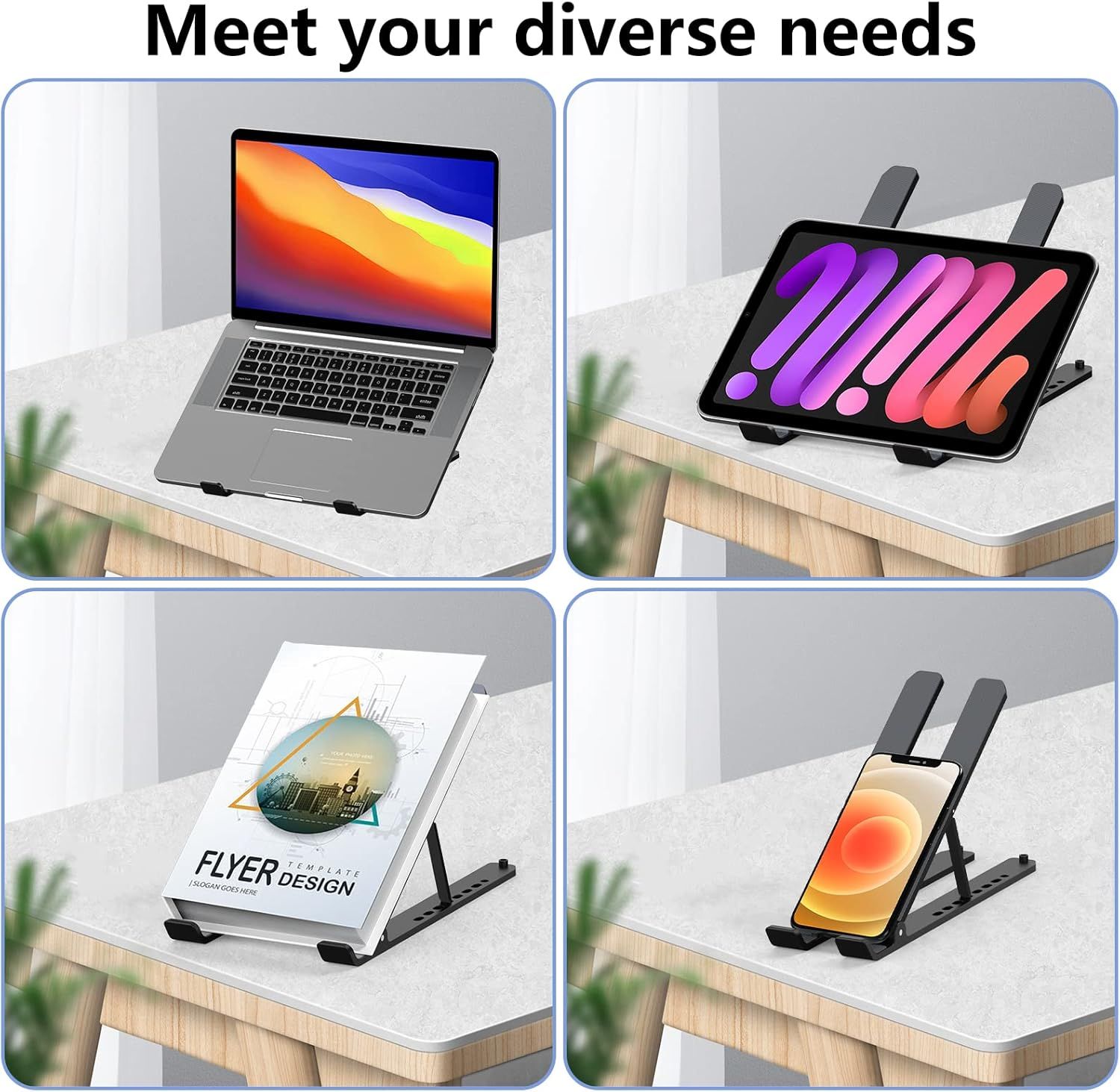 ✅ Remote Work/Entrepreneurship: More comfortable for long hours, boost efficiency, no laptop overheating✅ Business Trip/Mobile Work: Foldable & portable, build workspace anytime, anywhere✅ Student Study: Online classes & thesis writing, protect neck, focus more on study✅ Gaming & Entertainment: Good cooling, no laptop lag, better gaming experience✅ Multi-Device Compatibility: Besides laptops, compatible with tablet stands (Image 10), works for phones & tablets