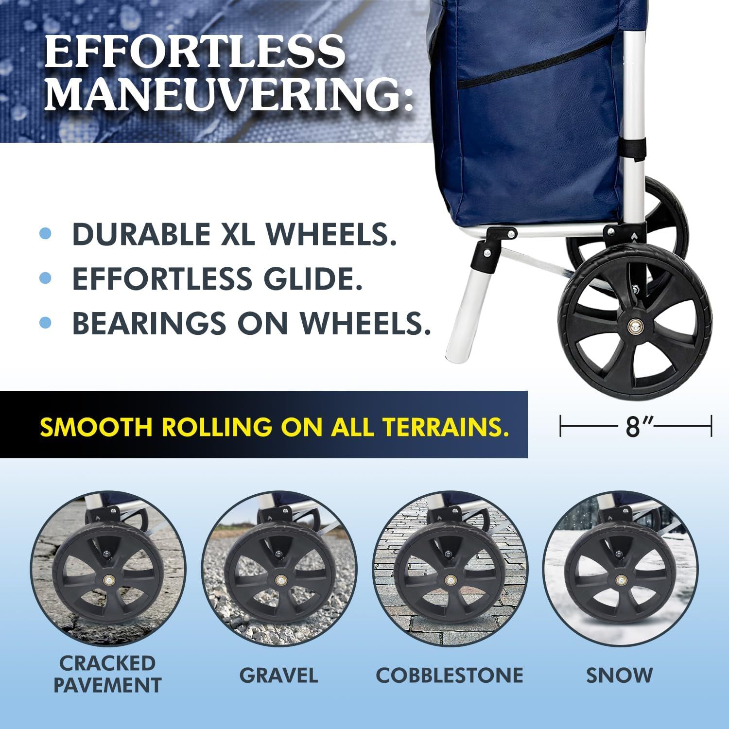 | Wheel Size | 8-inch enlarged rubber wheels with bearings | 6-inch ordinary plastic wheels without bearings |